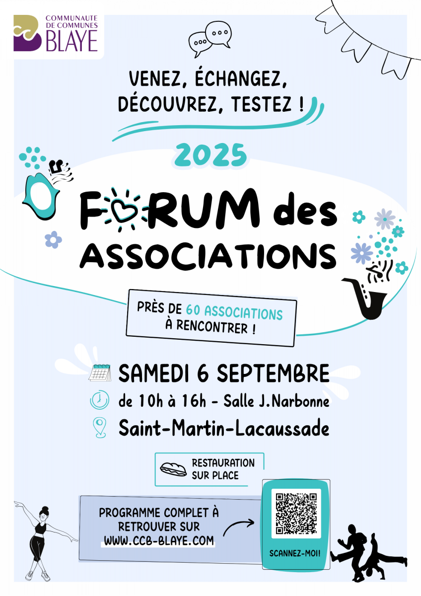 Samedi 6 septembre de 10h à 16h, le Forum intercommunal des associations de la Communauté de communes de Blaye est de retour à Saint-Martin-Lacaussade, salle Jacques Narbonne.
