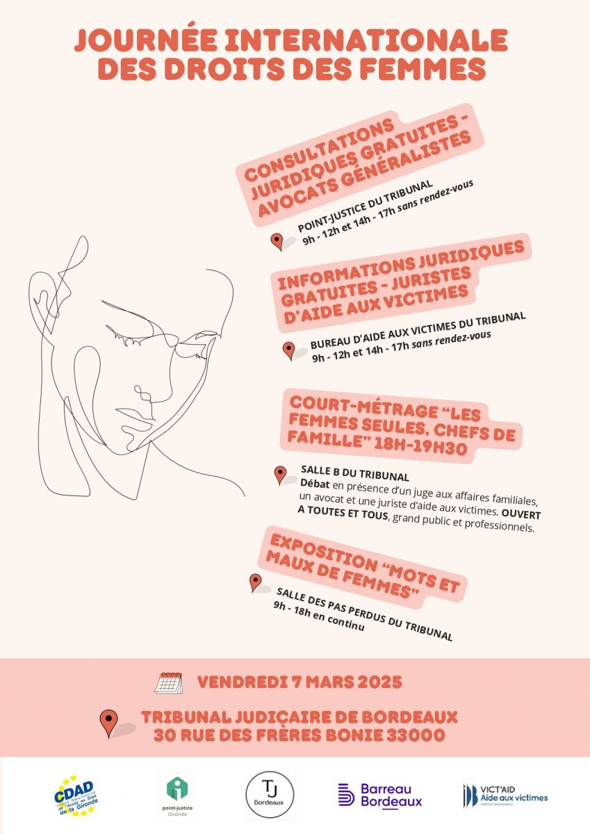 A l’occasion de la Journée internationale des droits des femmes, le CDAD de la Gironde collabore avec le Tribunal judiciaire, le Barreau de Bordeaux et l’association Vict’aid afin de vous proposer une journée entièrement dédiée à l’accès au droit des femmes le vendredi 7 Mars 2025.