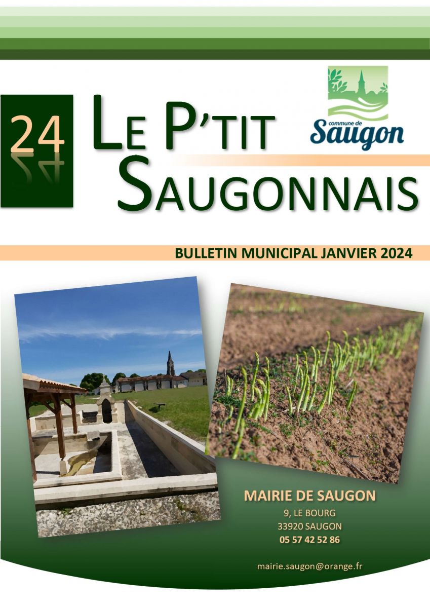 Comme chaque année, le bulletin communal est arrivé dans vos boîtes aux lettres ! Vous y retrouverez les infos de la commune, de l'école et des associations. L'actualité de la Communauté de Communes et une foule d'infos pratiques pour le quotidien de chacun et sur la vie de notre petite communauté. Le "P'tit Saugonnais" vit, se contruit au fil de l'année et se nourrit du vécu de chacun et chacune d'entre vous, d'entre nous. N'hésitez pas à être les temoins privilégiés des moments et des évènements de notre commune et à nous rapporter vos commentaires, vos idées, vos photos et vos contributions. Nous espérons que cette édition 2024 vous sera utile et nous remercions tout particulièrement les personnes qui ont participé à son élaboration.